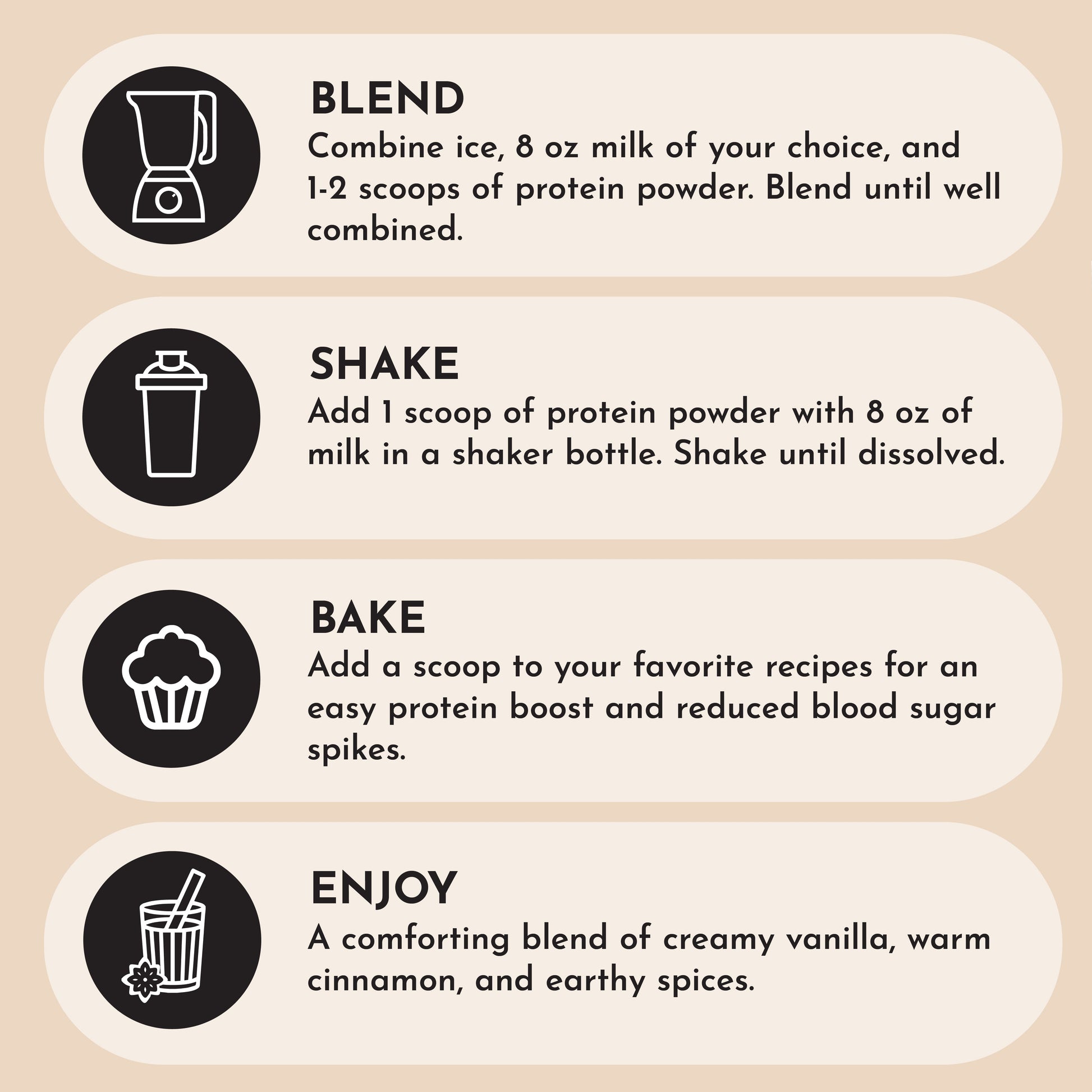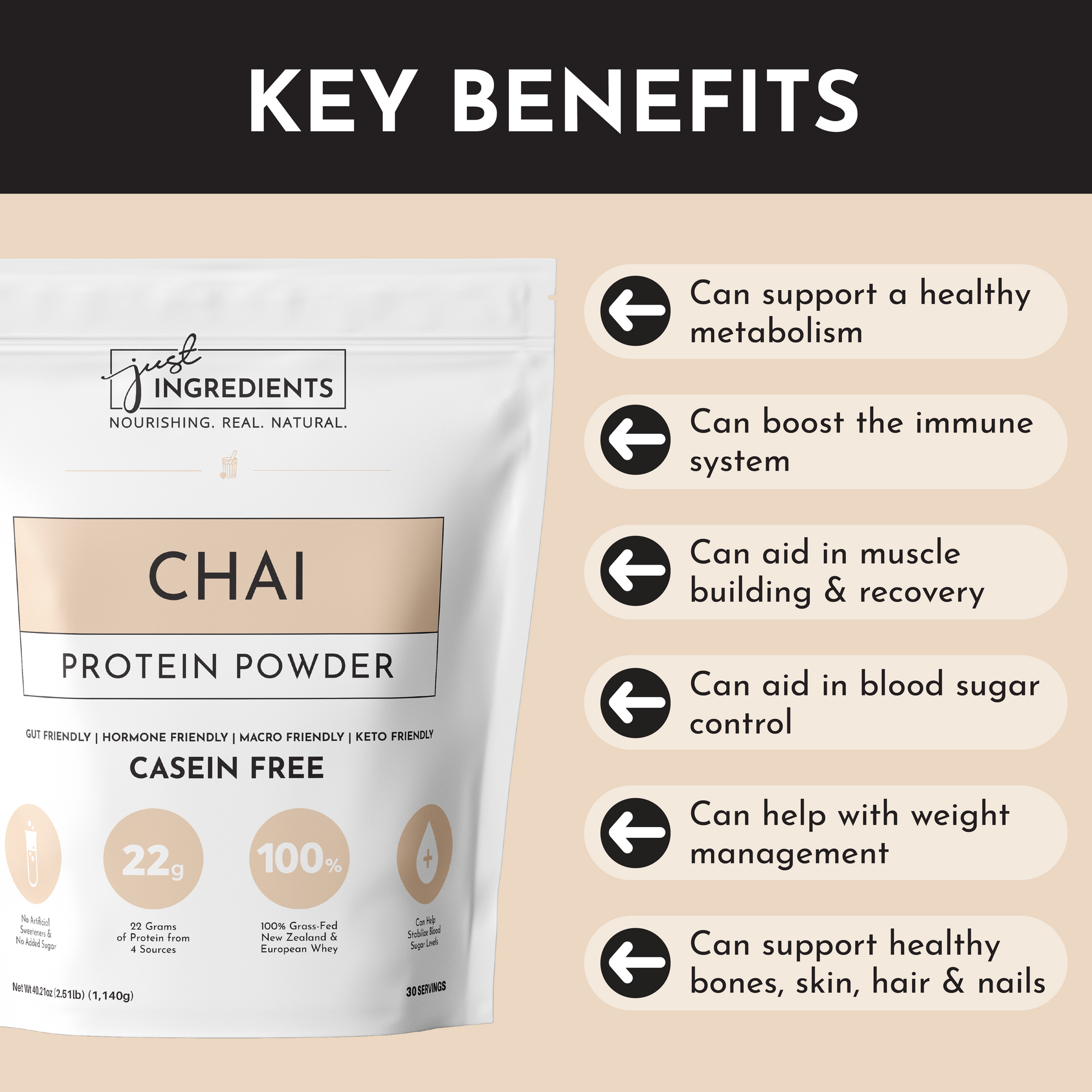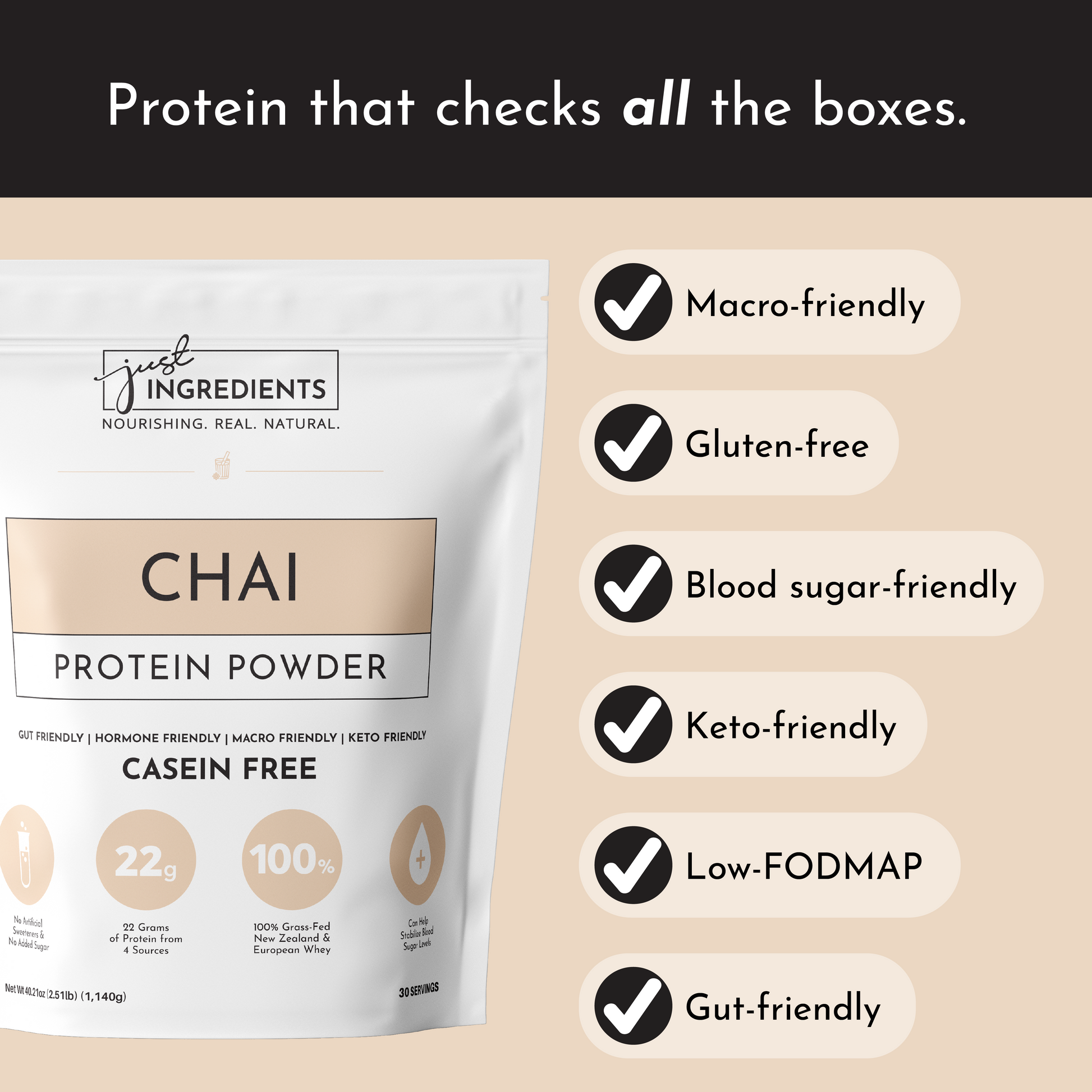 Chai Protein Powder, an all-natural protein powder made with four different protein sources and flavored without artificial sweeteners or sugar alcohols. Made with 100% grass-fed, non-denatured whey from New Zealand.