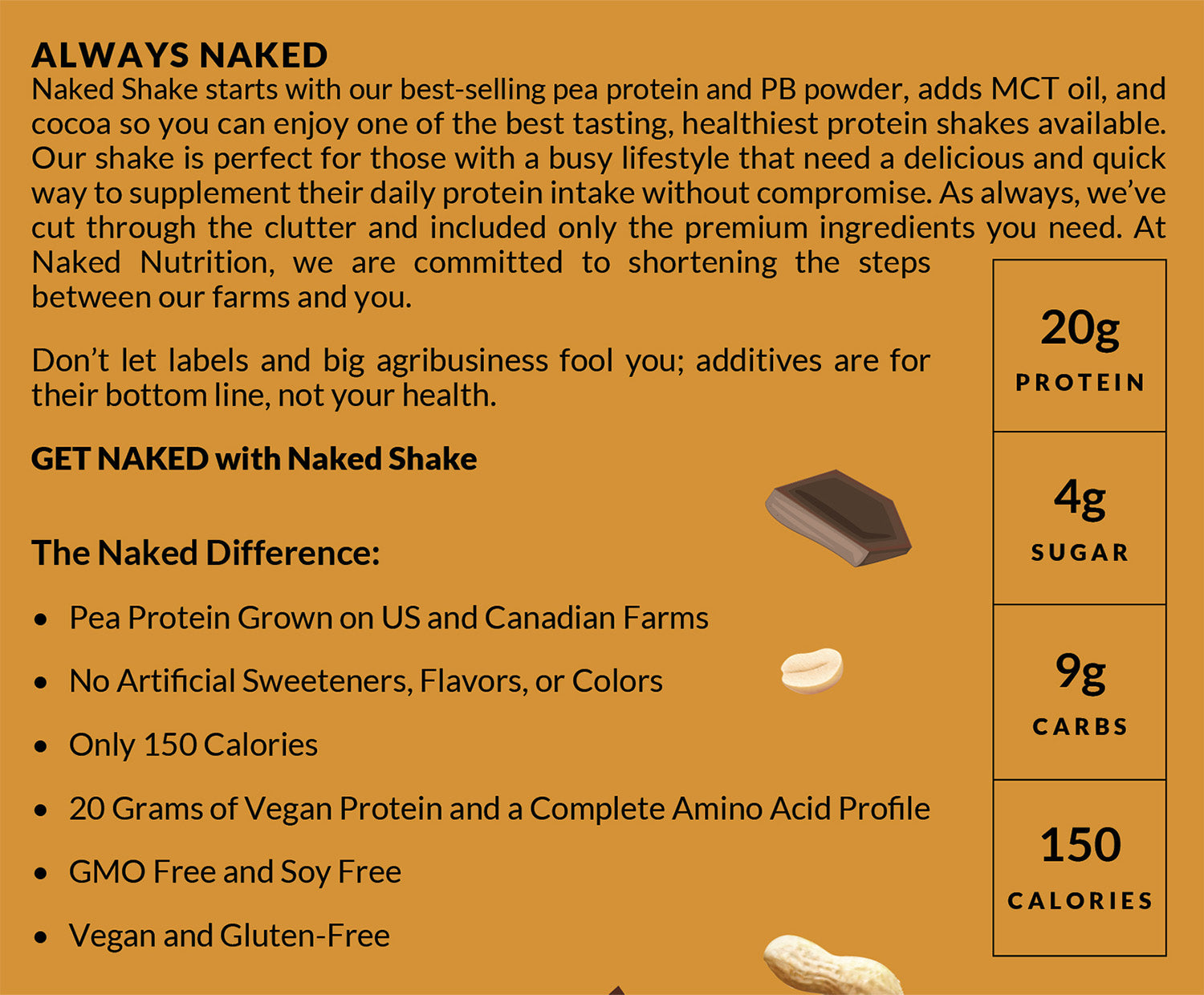 Satisfy your chocolate peanut butter cravings and increase daily protein intake on a busy schedule. Chocolate PB Naked Shake starts with our best-selling pea protein, adds MCT oil, and natural plant-based flavors. The result is a crave-worthy shake that delivers 20g of protein and only 4g of sugar. Naked Shake only contains the premium ingredients you need to maintain optimal energy levels and manage a healthy weight.