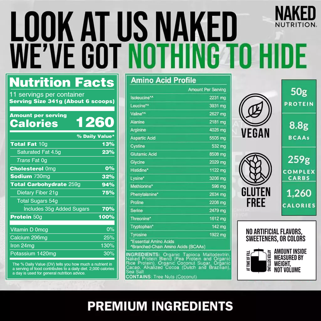 Vegan Naked Mass is an ideal between meal or before bed supplement to maintain a high protein and calorie diet. We've combined our pea protein, organic brown rice protein, and organic tapioca maltodextrin to deliver the optimal ratio of clean source multi-phase protein and complex carbohydrates to gain and maintain lean mass. To ensure a complete amino acid profile, the ratio of pea to rice protein is 2:1. Instead of using inferior corn or wheat based maltodextrins, Naked Mass’s maltodextrin comes from organic tapioca which is naturally gluten free. We are committed to shortening the steps between our farms and you.