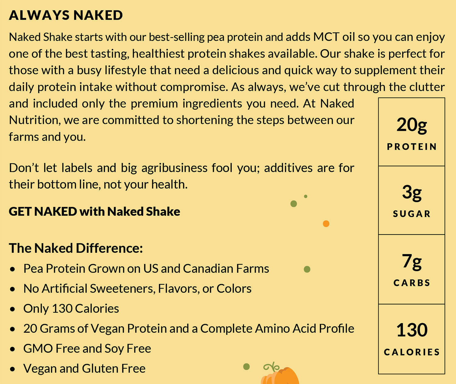 Celebrate the autumn season with Pumpkin Spice Naked Shake, the tastiest way to increase your daily protein intake on a busy schedule. It starts with our best-selling pea protein, adds MCT oil, cinnamon, fermented cane sugar, and natural plant-based flavors.