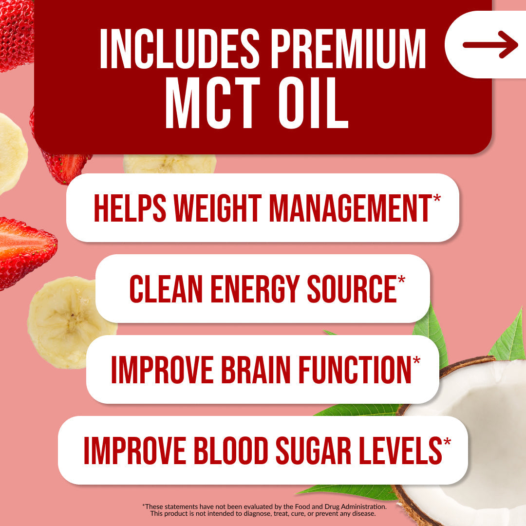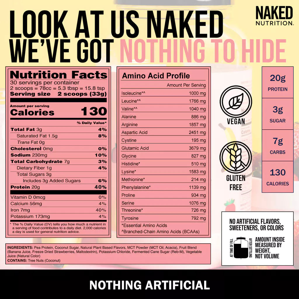 Naked Shake is the tastiest way to increase your daily protein intake on a busy schedule. It starts with our best-selling pea protein, adds MCT oil, and a strawberry banana juice blend. The result is a crave-worthy shake that delivers 20g of protein and only 3g of sugar. Naked Shake only contains the premium ingredients you need to preserve lean muscle and support your weight loss goals.